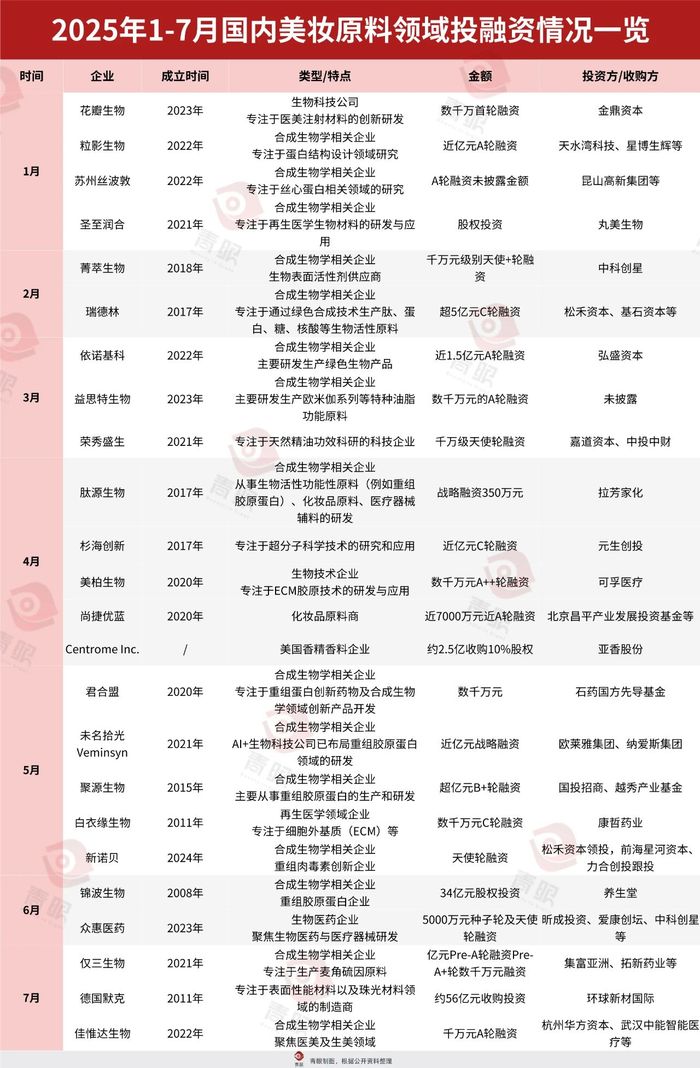 无能否认,最近几年来,美妆赛道本钱的眼光愈来愈聚焦在以原料为代表的上游企业。据青眼不彻底统计,2025年1月至7月,海内至少有24家美妆原料相干企业完成投融资。